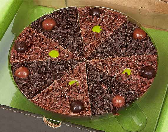 Esta deliciosa pizza de 25,5 centímetros, está conformada en su base por chocolate con leche, chocolate belga negro y aceite de menta, que le da un toque refrescante muy apetecible. Las bolitas decorativas que veis en la imagen están hechas con arroz inflado y bañadas en chocolate. El regalo, por último, se completa que unas deliciosas virutas de chocolate con leche.