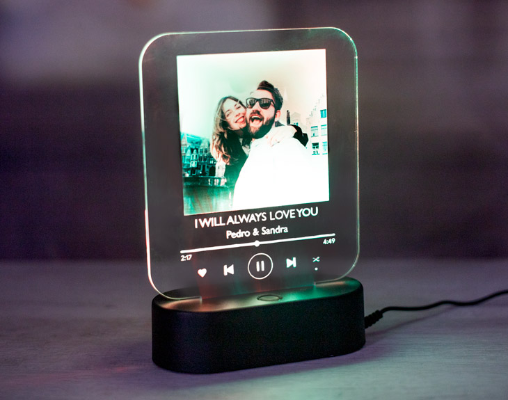 Discoteca en tu salón. ¿Echas de menos ir a bailar fuera de casa? Llévate la fiesta a tu propio salón. ¡La decoración es lo más importante! Baja las persianas, pon Spotify en tu televisor o altavoz e invita a tu pareja a bailar esa canción que os une y que es especial sin importar dónde suene. El punto romántico definitivo será iluminar la habitación con las luces tenues de colores de esta lámpara de metacrilato sobre la que podrás inmortalizar vuestra foto más romántica y escribir vuestros nombres y el nombre de esa canción.
